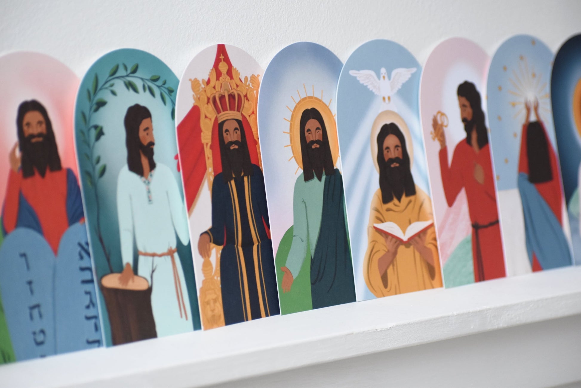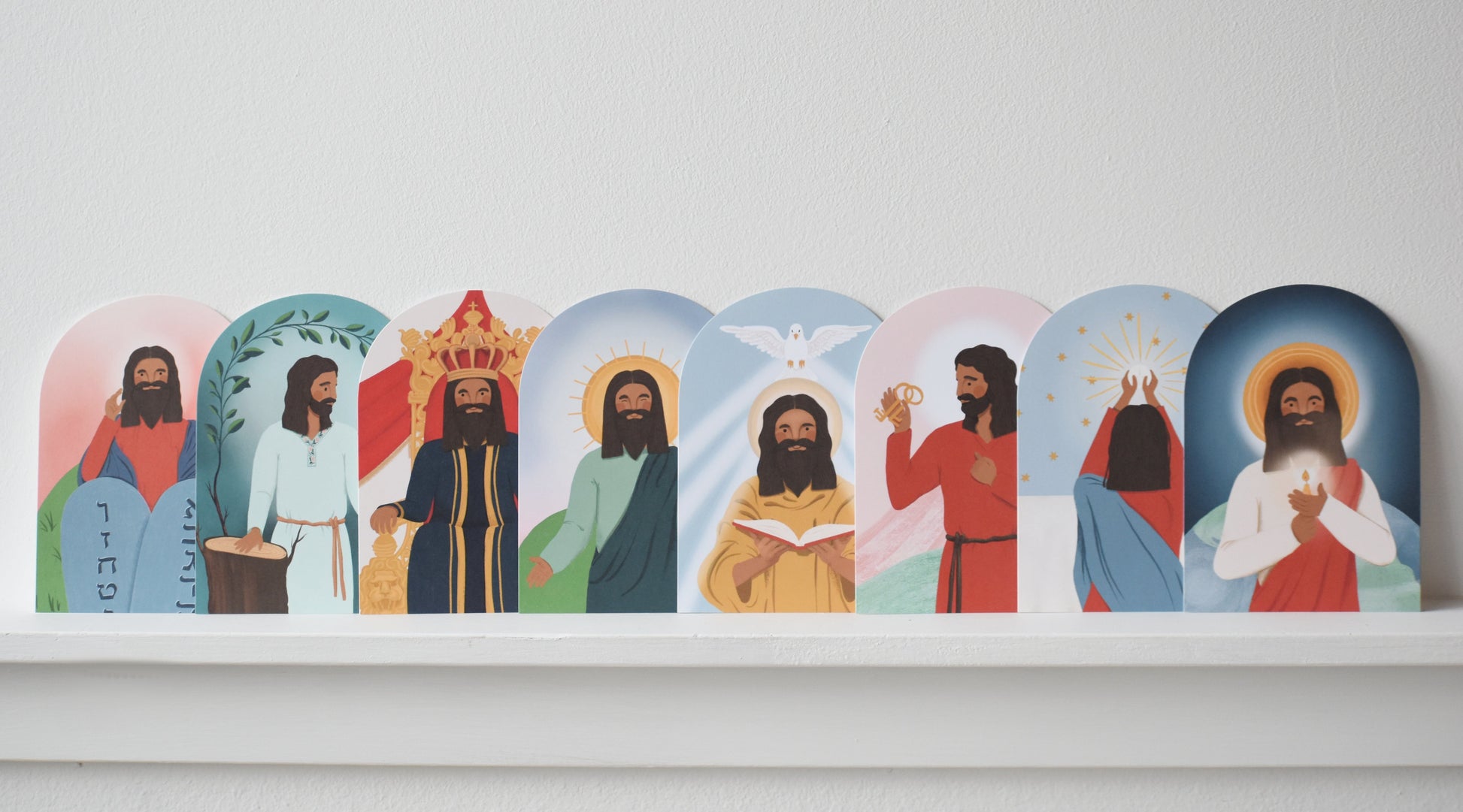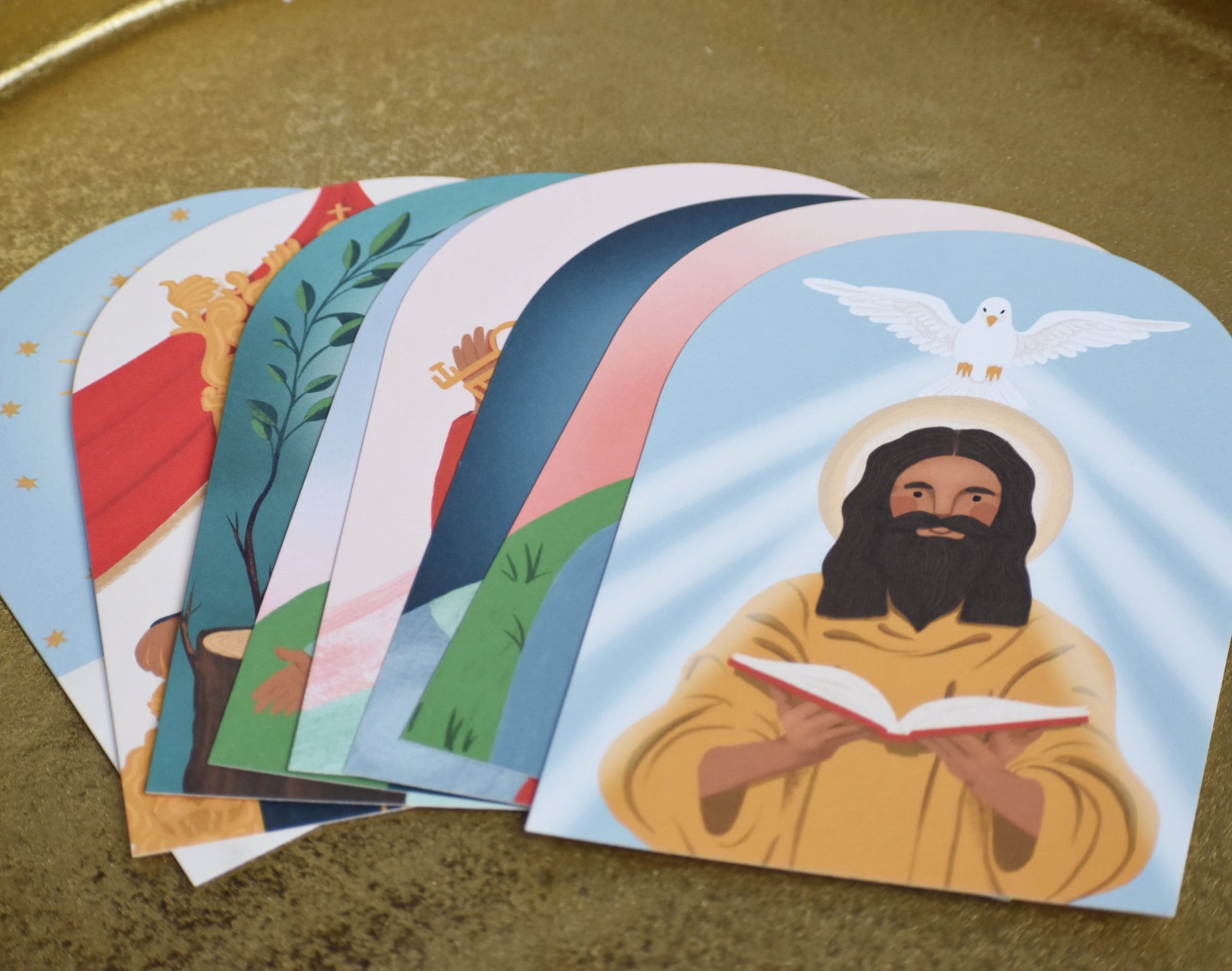 A beautifully illustrated set of 8 5x7 arch-shaped cards to accompany the O antiphons. Each card has an illustration and an a brief explanation. There is also an information card explaining the O antiphons.