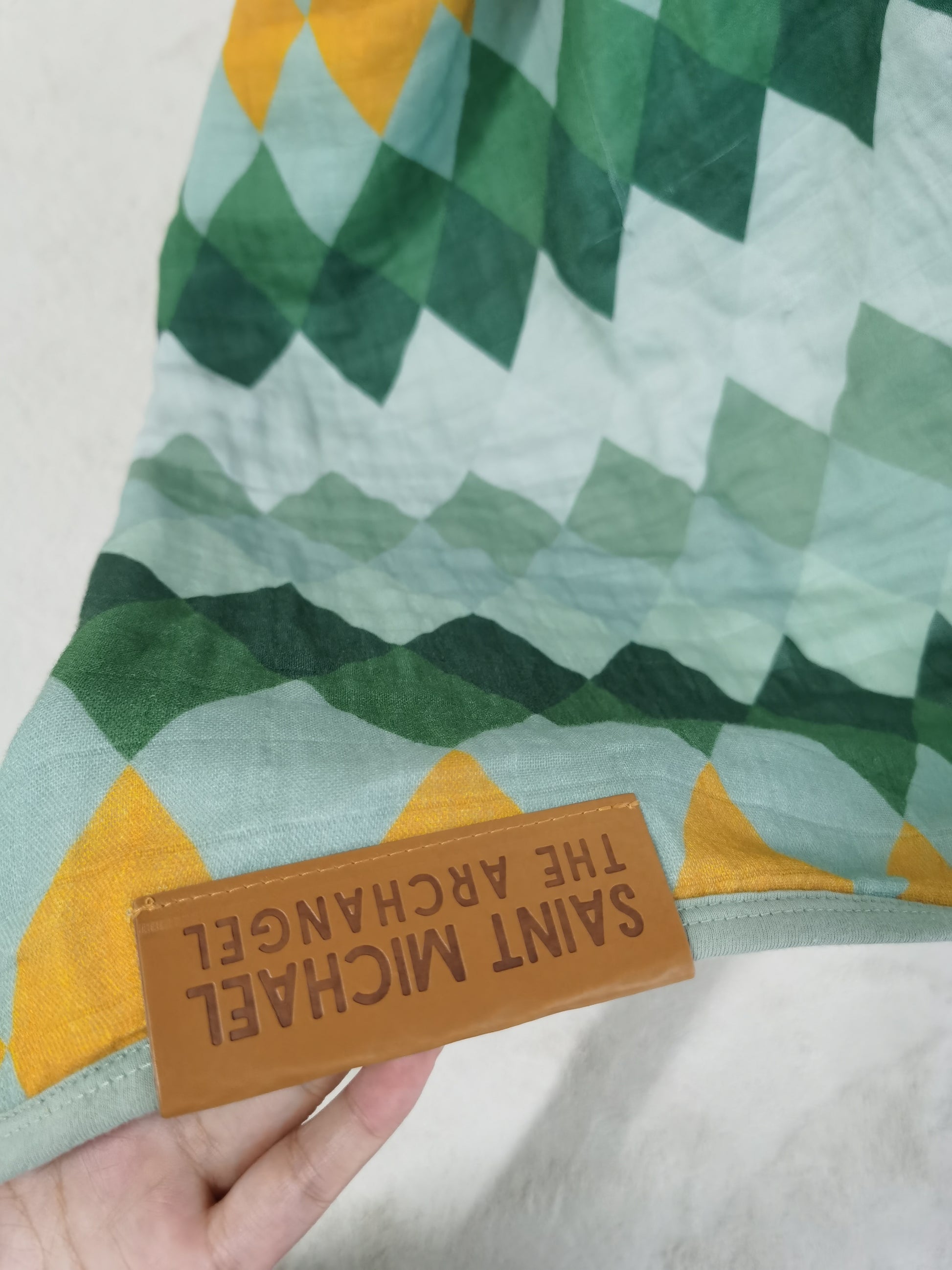 A generous 47"x47" with organic, OEKO-TEX certified cotton and a special PU leather prayer tag that reads Saint Michael the Archangel, Defend Us in Battle.