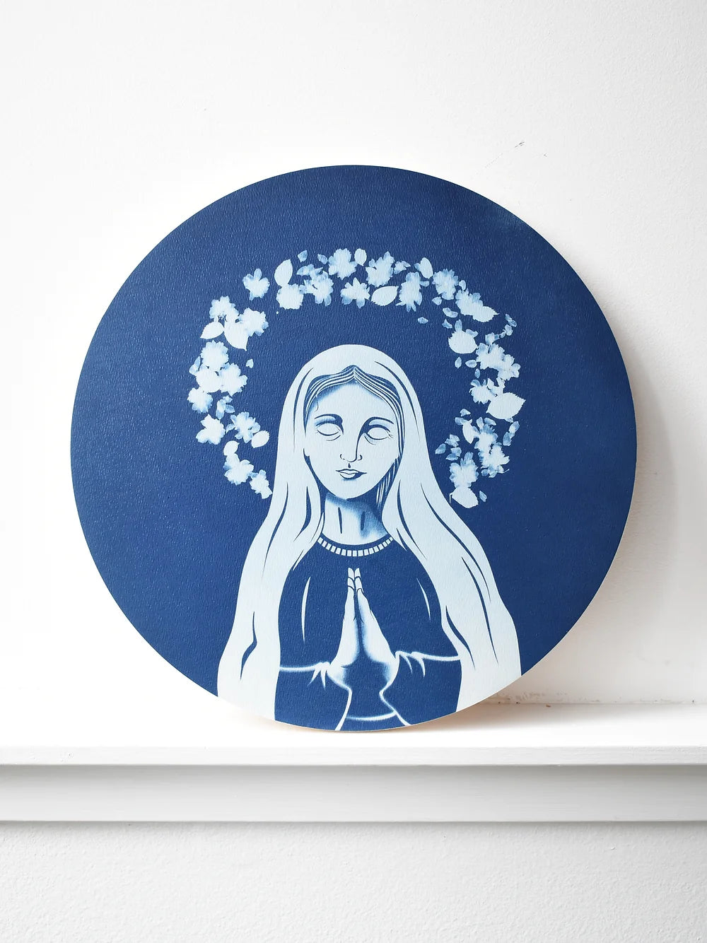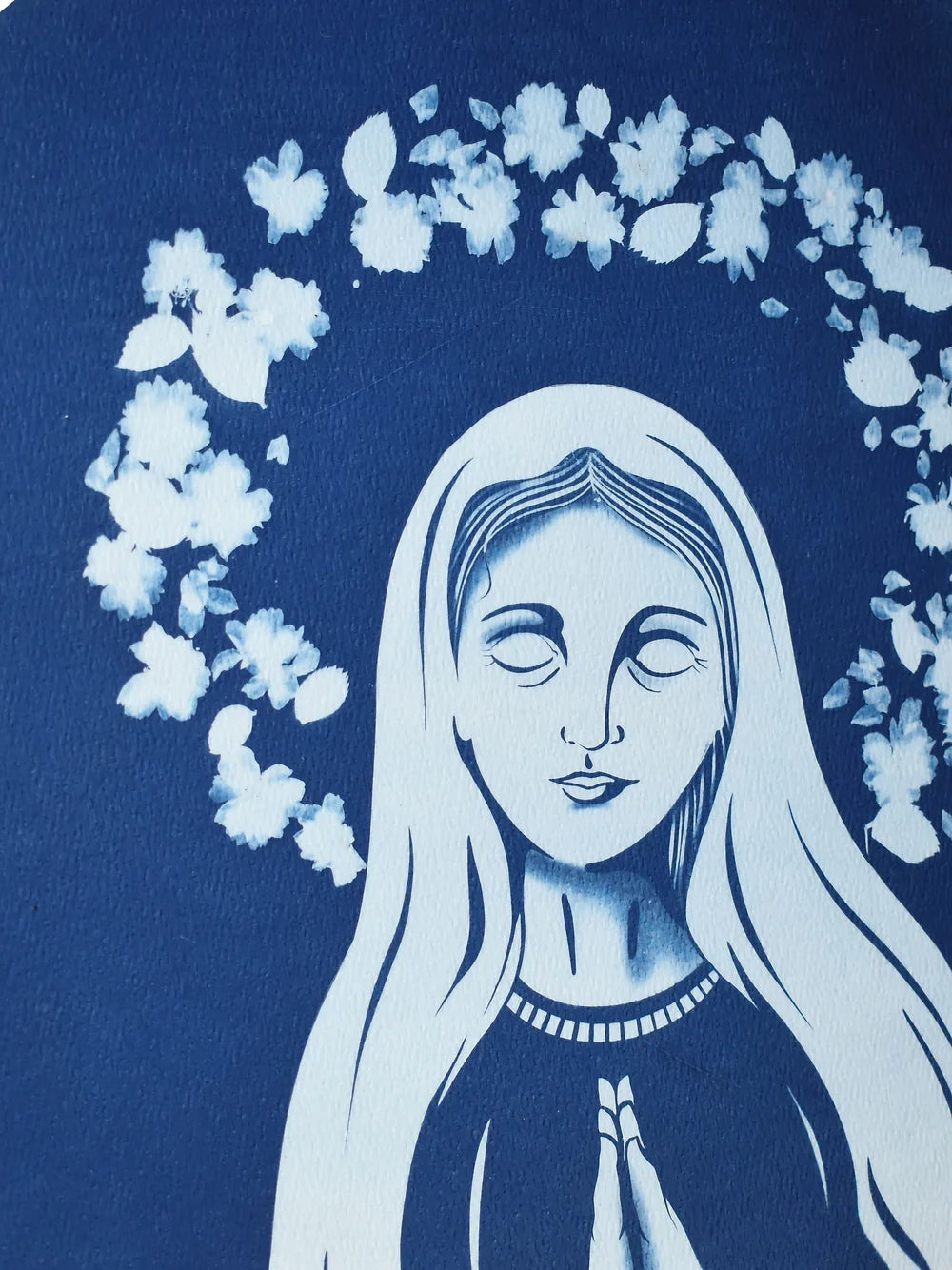 Made using a process called cyanotype. Cyanotype is a photographic printing process that produces a cyan-blue print. Engineers used the process well into the 20th century as a simple way to produce copies of drawings known as blueprints. The process uses two chemicals, ferric ammonium citrate and potassium ferricyanide, the sun and a lot of patience mingled with grace. Each piece is unique and perfect in its imperfection. No two colors are exactly the same based on the amount of sun exposure and brightness at the time. Lines, gradient and water spots may be present and are all part of this unique process.