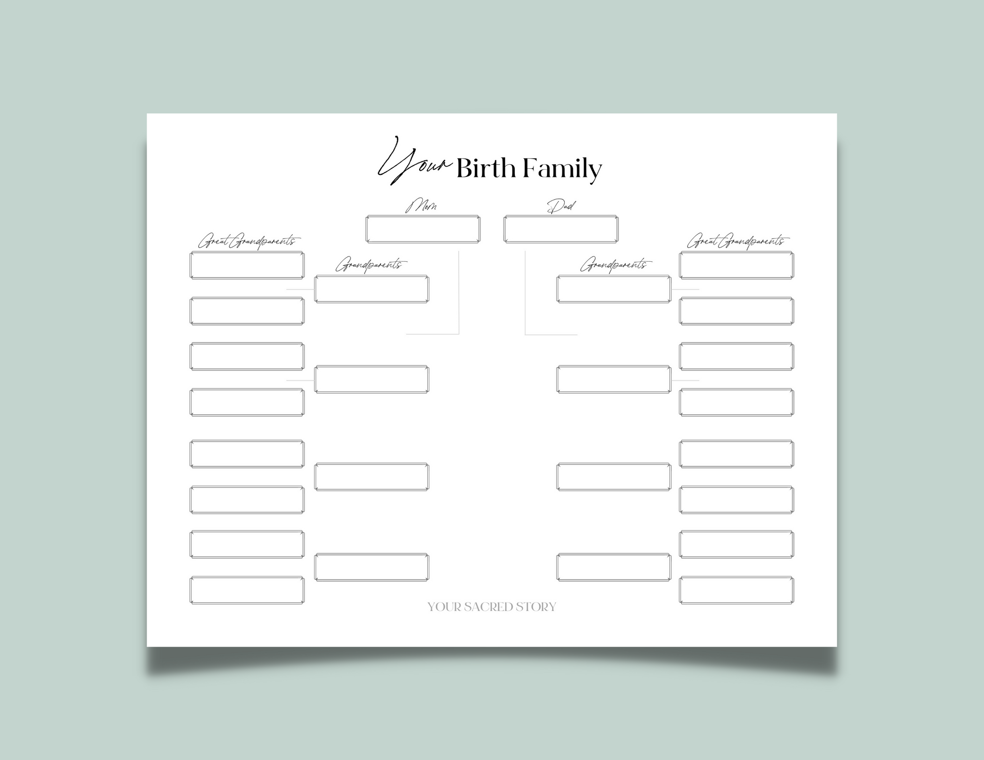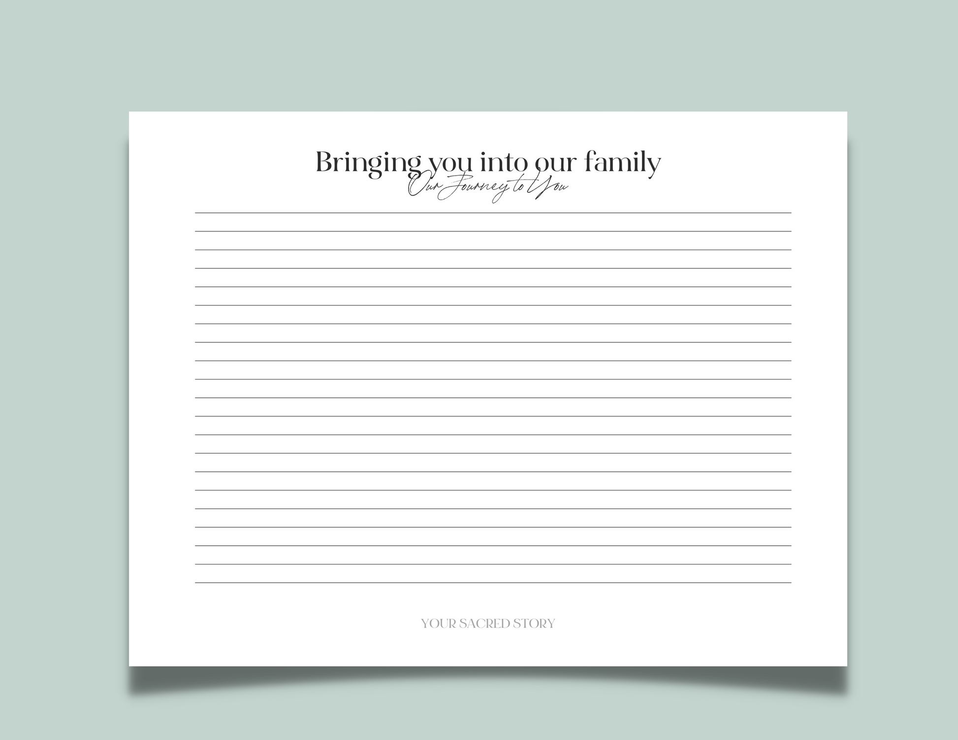 Customize Your Sacred Story to fit your family with the Adoption Pages Add-on pack. Includes: Birth Mom, Birth Dad, Birth Parent's Story, Birth Family Tree, Bringing you into our family.