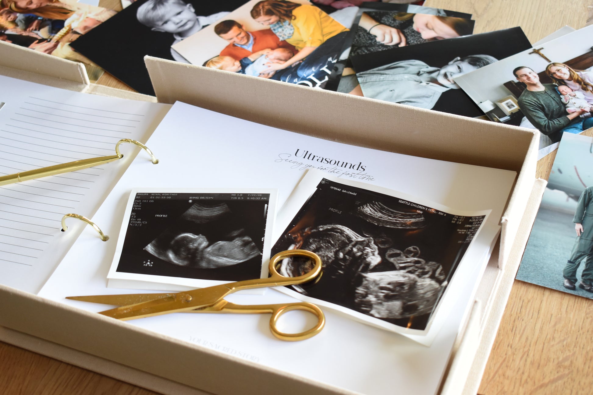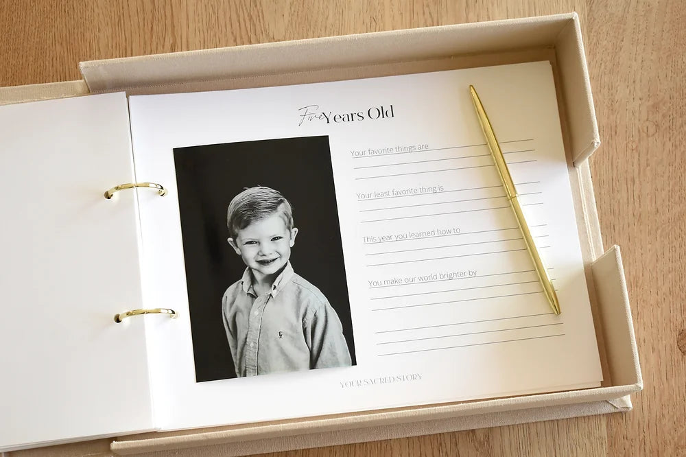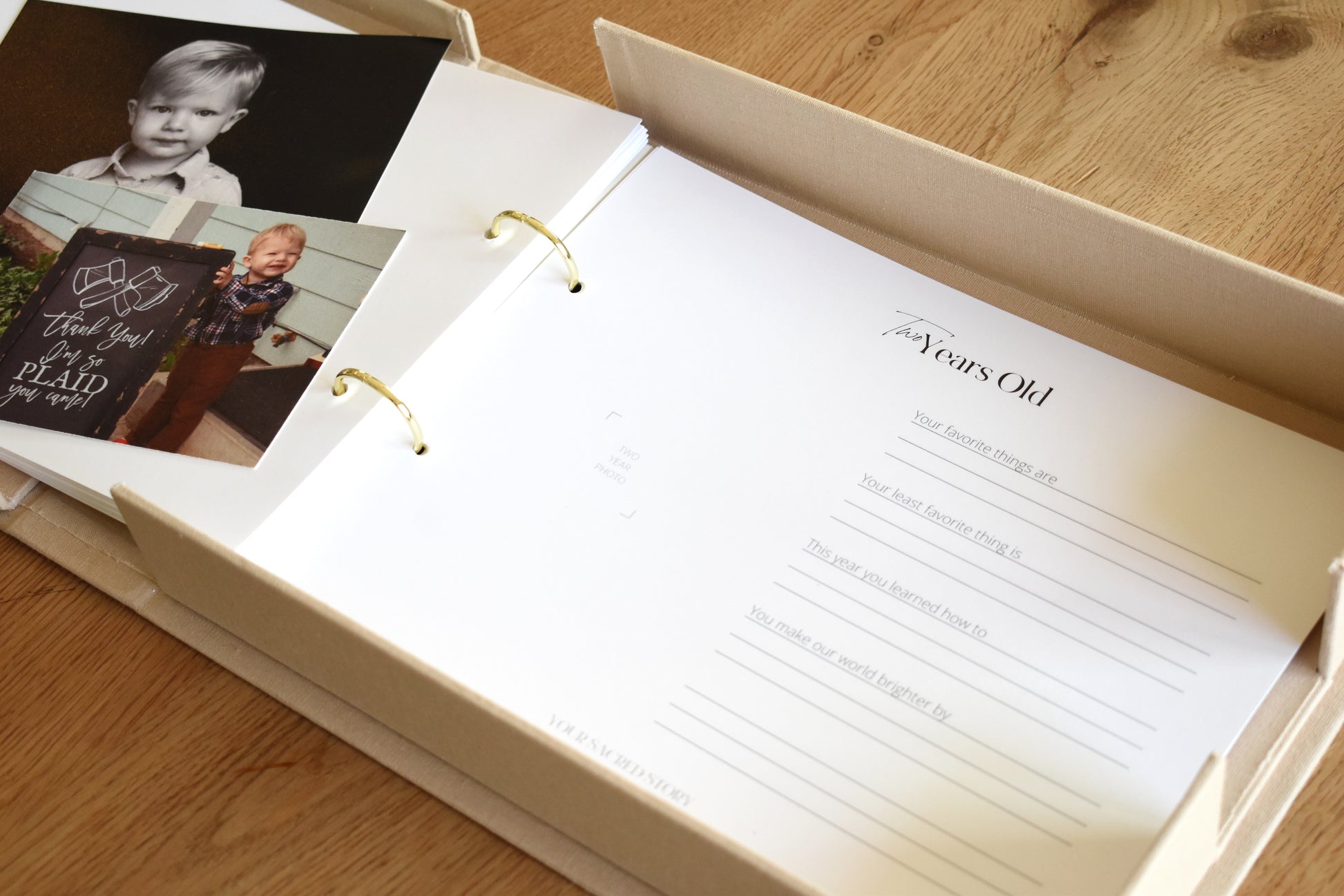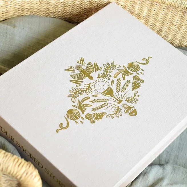 Your pregnancy journal, birth story, infancy tracker, sacraments keepsake and childhood memory book all wrapped into one beautiful (Catholic) heirloom linen binder box.